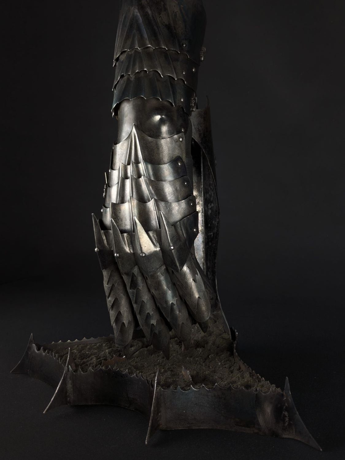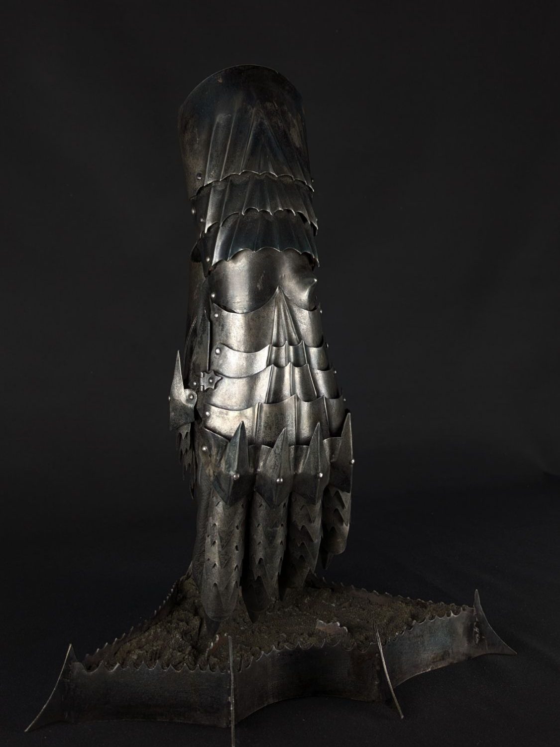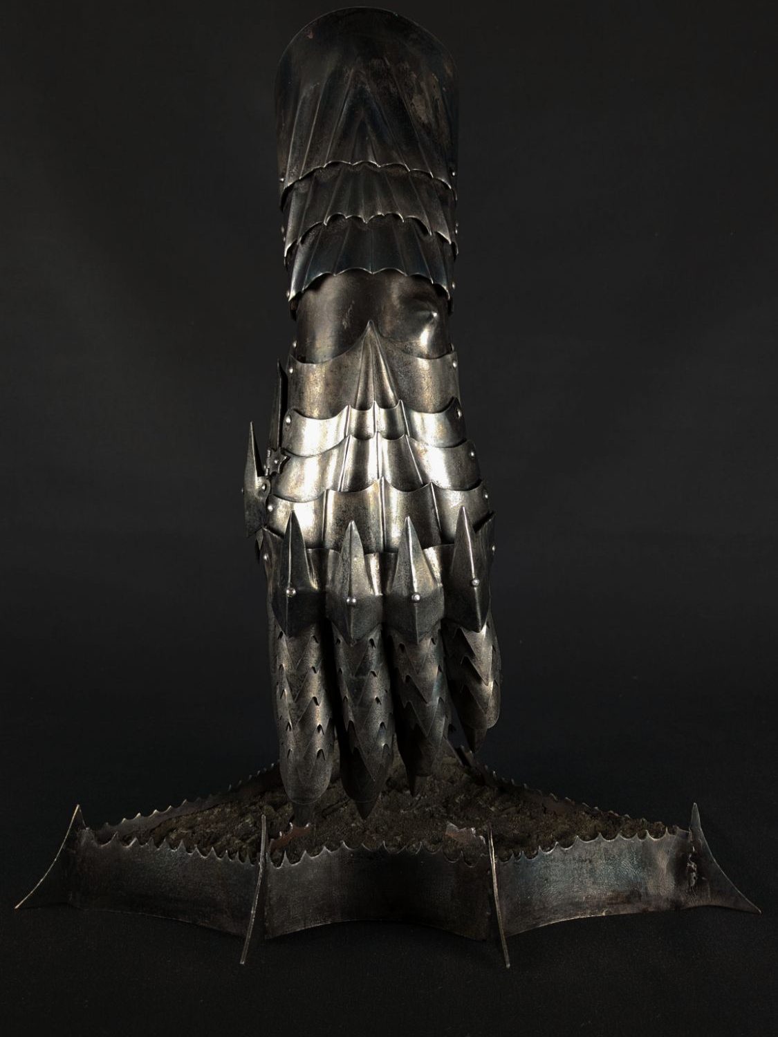 Ce gantelet Nazgûl en acier repose sur un piédestal métallique aux lignes sombres, sur un sol d’imitation pierre marqué par le temps.